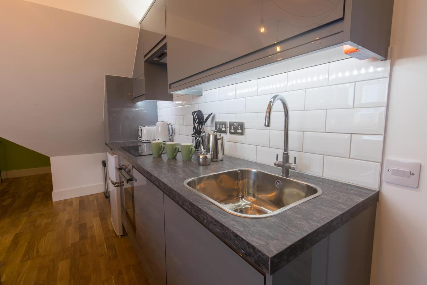 Each unit is fully fitted with a washing machine, a flat-screen TV, a sofa and desk. An oven and microwave are also available, as well as a kettle.
