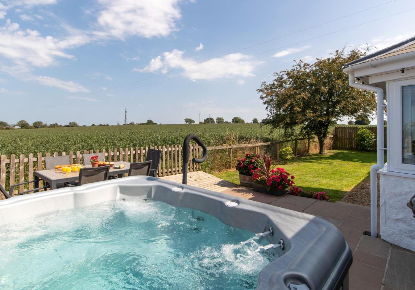 Three-Bedroom House. This holiday home features a hot tub. Boasting a private entrance, this spacious holiday home also features 3 separate bedrooms, 2 bathrooms with a hairdryer, a kitchen and a dining area. Guests will find a stovetop, a refrigerator, a dishwasher and an oven in the kitchen. The holiday home also comes with a barbecue. The holiday home features a washing machine, a tea and coffee maker, a seating area, a TV, as well as garden views. The unit has 5 beds.