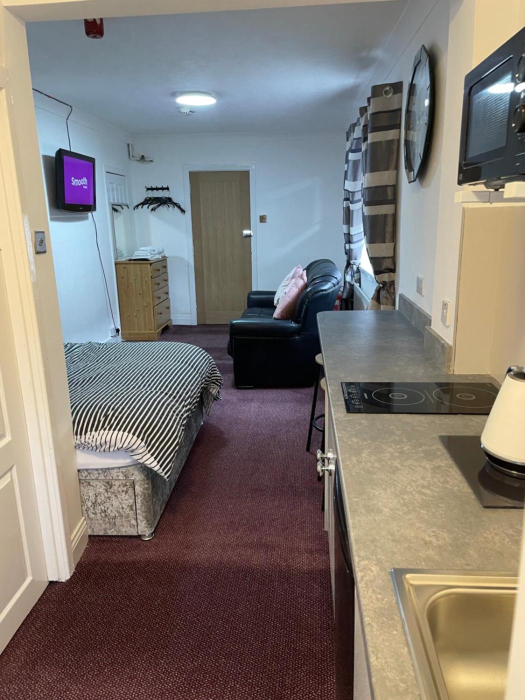 Small Double Room. The spacious double room features a seating area, an electric kettle, as well as a private bathroom boasting a shower. The double rooms kitchen is available for cooking and storing food. The double room provides a flat-screen TV, a sofa, a carpeted floor, heating as well as ancourtyard view. The unit has 1 bed.